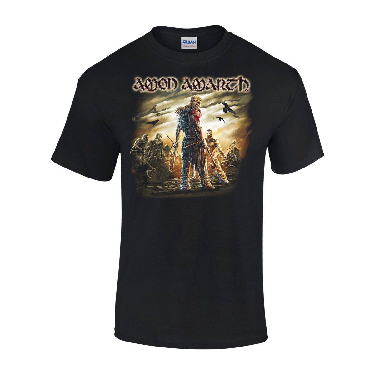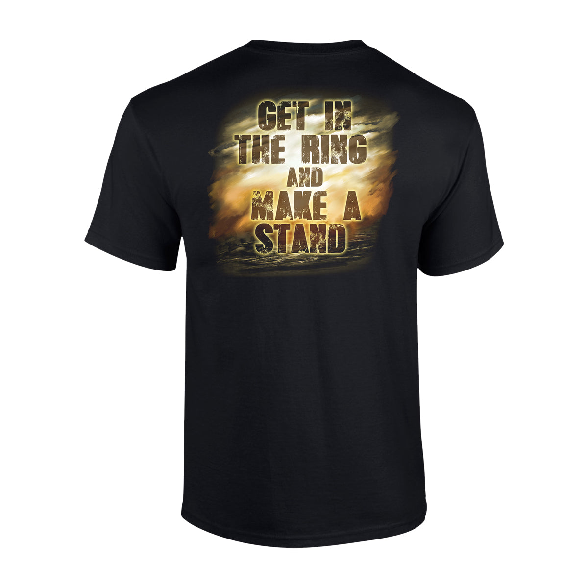 Unisex T-shirt in black featuring Amon Amarth "Get In The Ring" artwork printed on the front and back.