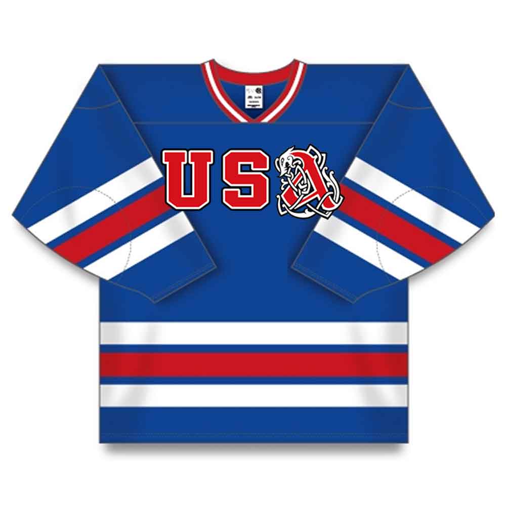 Hockey Jersey featuring Amon Amarth “USA Hockey” artwork printed on the front and back.