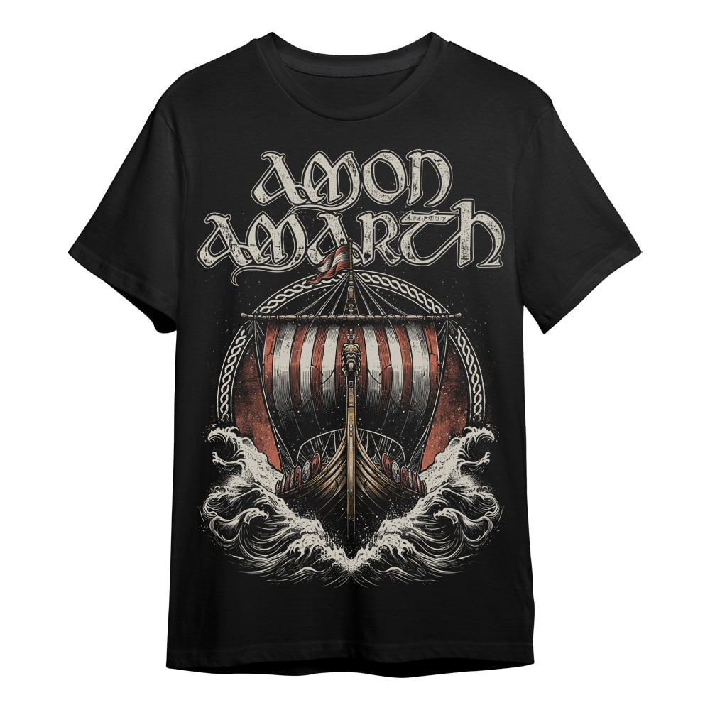 Unisex T-shirt in black featuring Amon Amarth "We Rule The Waves" artwork printed on the front and back.