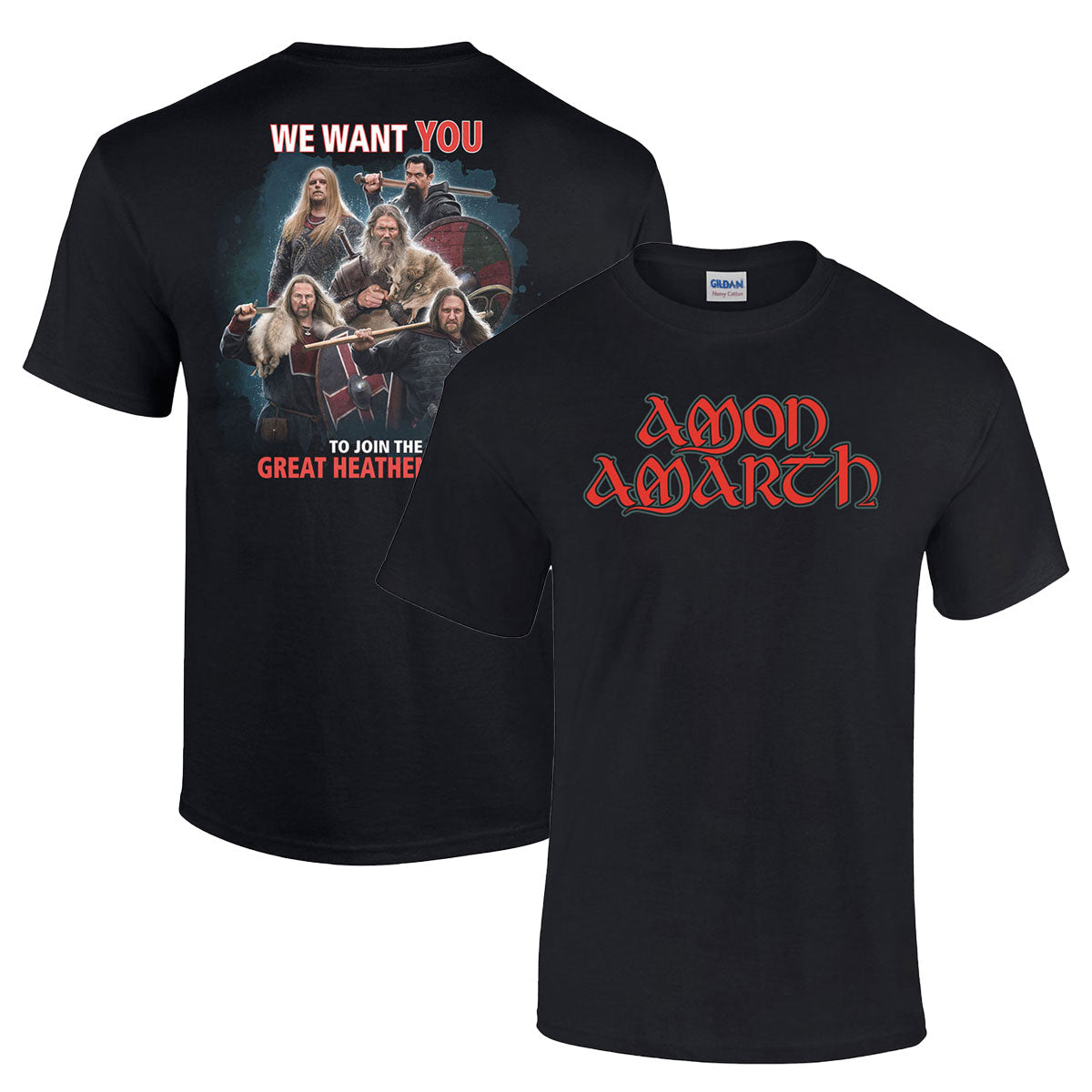 Unisex T-shirt in black featuring Amon Amarth "We Want You" artwork printed on the front and back.